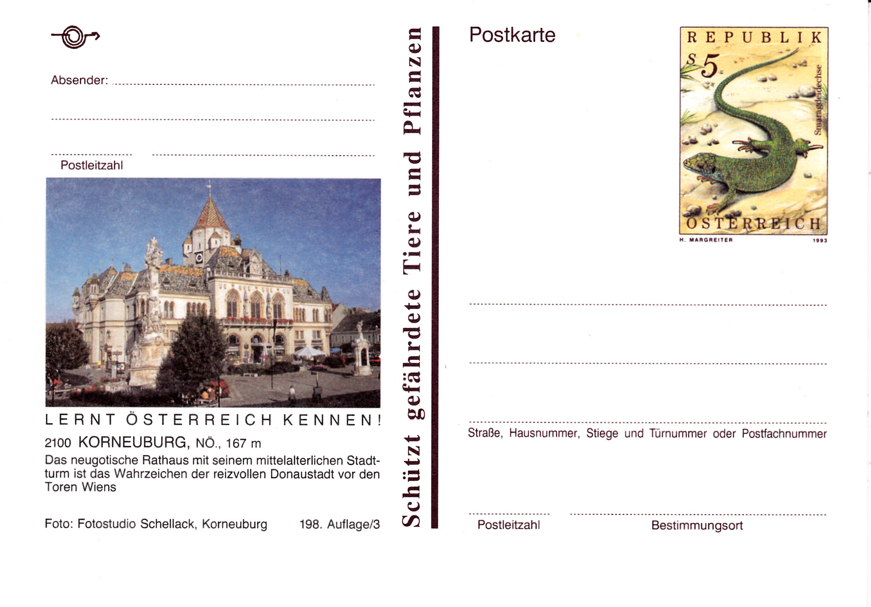 Die im ersten Beitrag hier gezeigte Ganzsachen-Postkarte aus Österreich mit dem Wertstempel "Smaragdeidechse" gibt es auch als Bildpostkarte. Hier ein Beispiel eine Karte mit einer Abbildung aus Korneuburg.