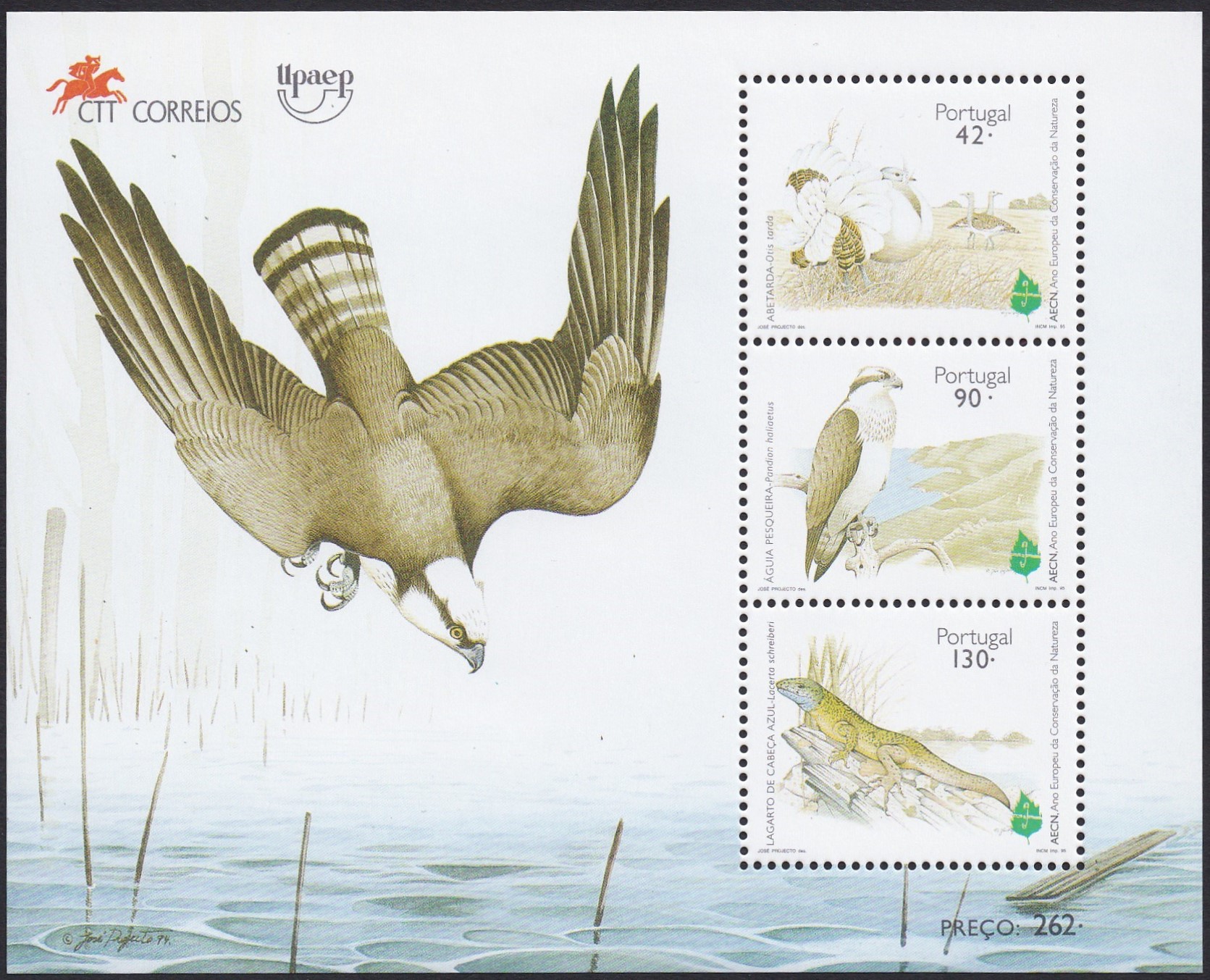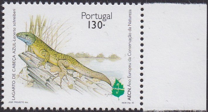 Auf dieser Marke aus Portugal (MiNr 2065 A) zum Europäischen Naturschutzjahr ist eine Iberische Smaragdeidechse (Lacerta schreiberi) zu sehen.
