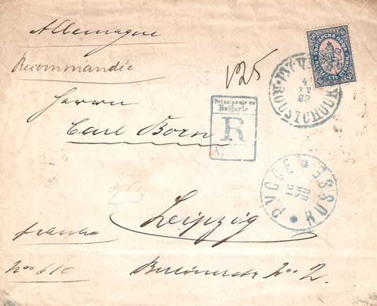 Portogerecht frankiert wurde dieses Einschreiben mit der 50 Stotinki Marke MiNr. 20 ( 25 Stotinki für Auslandsbriefe bis 15 Gramm + 25 Stotinki Einschreibegebühr). Der Brief wurde in Russe aufgegeben am 16.XII.1888 und erreichte Leipzig am 18.12 zwischen 10 und 11 Uhr am Vormittag.