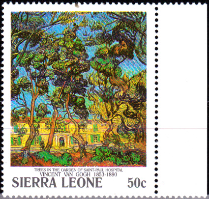 Die Marke zu 50 Cent (MiNr 1616) aus der Serie zum "100. Todestag von Vincent van Gogh" aus Sierra Leone zeigt das Bild "Bäume im Garten von Saint-Paul Hospital".