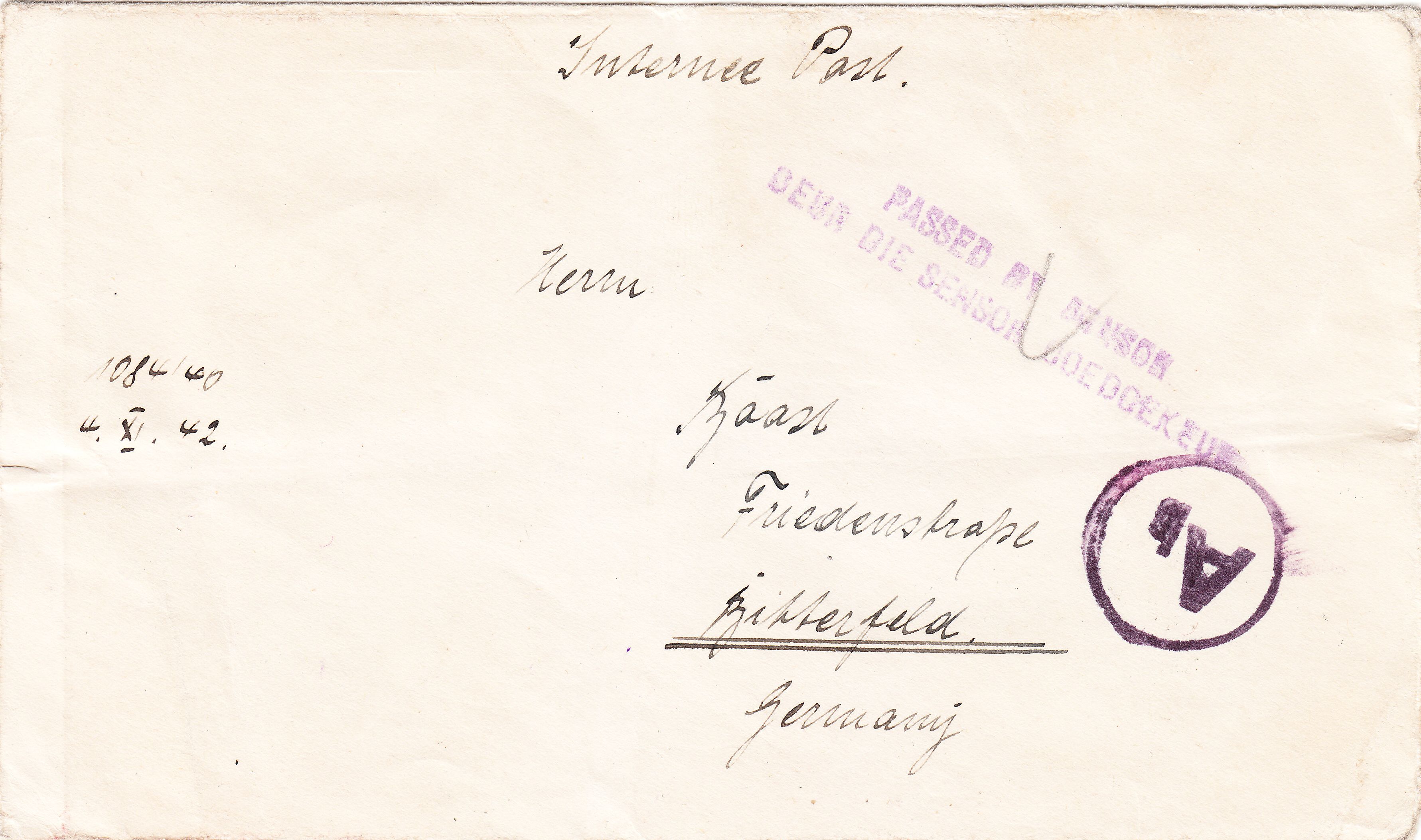 Hier als Beispiel ein Brief aus dem November 1942, adressiert nach Bitterfeld, der als Interniertenpost = "Internee Post" portofrei im Lager Baviaanspoort-Pretoria in Südafrika aufgegeben wurde: