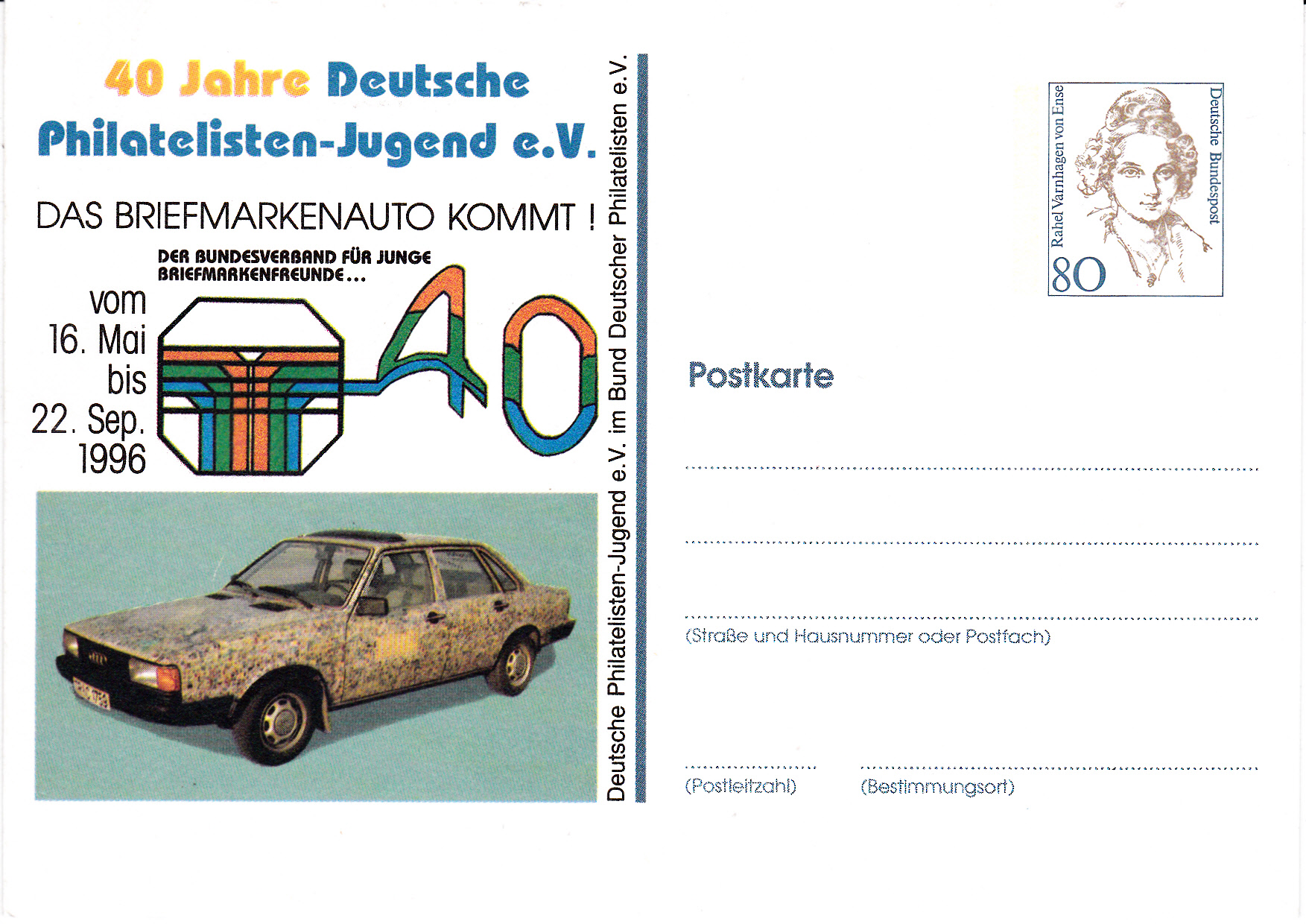 1996 wurde zum Jubiläum "40 Jahre Deutsche Philatelisten Jugend e.V." eine Privatganzsachenkarte mit der Abbildung des hier in den beiden ersten Beitrag gezeigten Audi hergestellt.