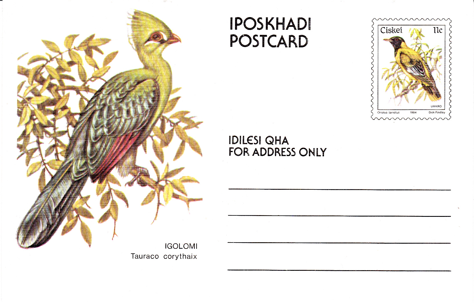 Auf dieser Ganzsache aus der Ciskei (vom 4.12.1981 bis 27.4.1994 von Südafrika unabhängiges Homeland) wird auf dem seitlichen Bild ein Federhelmturako(Tauraco corythaix) gezeigt. Dieses Motiv gibt es auch als Markenmotiv (Ciskei MiNr 5). Der Wertstempel zeigt einen Schwarzkopfpirol (Oriolus larvatus).