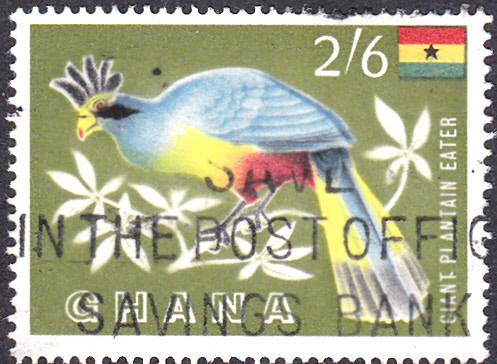 Auch auf dieser Marke aus Ghana (MiNr 58) ist ein Riesenturako (Corythaeola cristata) zu sehen.