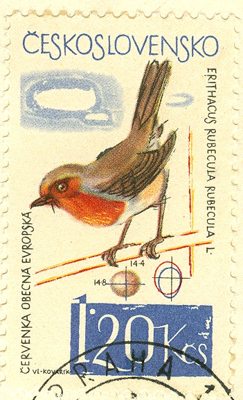1964 bekam der 1 Kronen 20 Heller-Wert einer Motivausgabe "Vögel" der tschechoslowakischen Postverwaltung (MiNr 1499) ein Rotkehlchen (Erithacus rubecula rubecula L.) ins Markenbild gesetzt. Ältere graphische Varianten gewinnen immer wieder bei jüngeren Motivsammlern viele Sympathiepunkte. Zu Recht, wie ich meine.