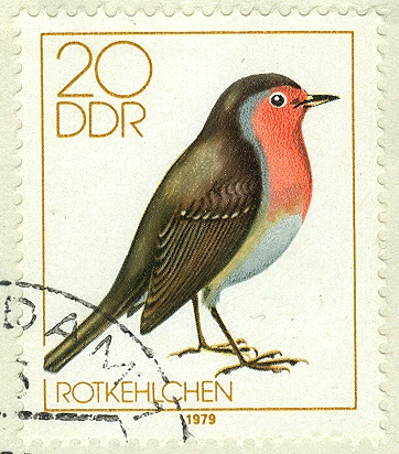 Eines der Motive der DDR-Ausgabe "Heimische Singvögel" widmete die herausgevende Postverwaltung dem Rotkehlchen (MiNr. 2390). Der mehrfarbige 20 Pfennig-Wert erschien am 9. Januar 1979 in einer Auflage von 8.000.000 Stück.