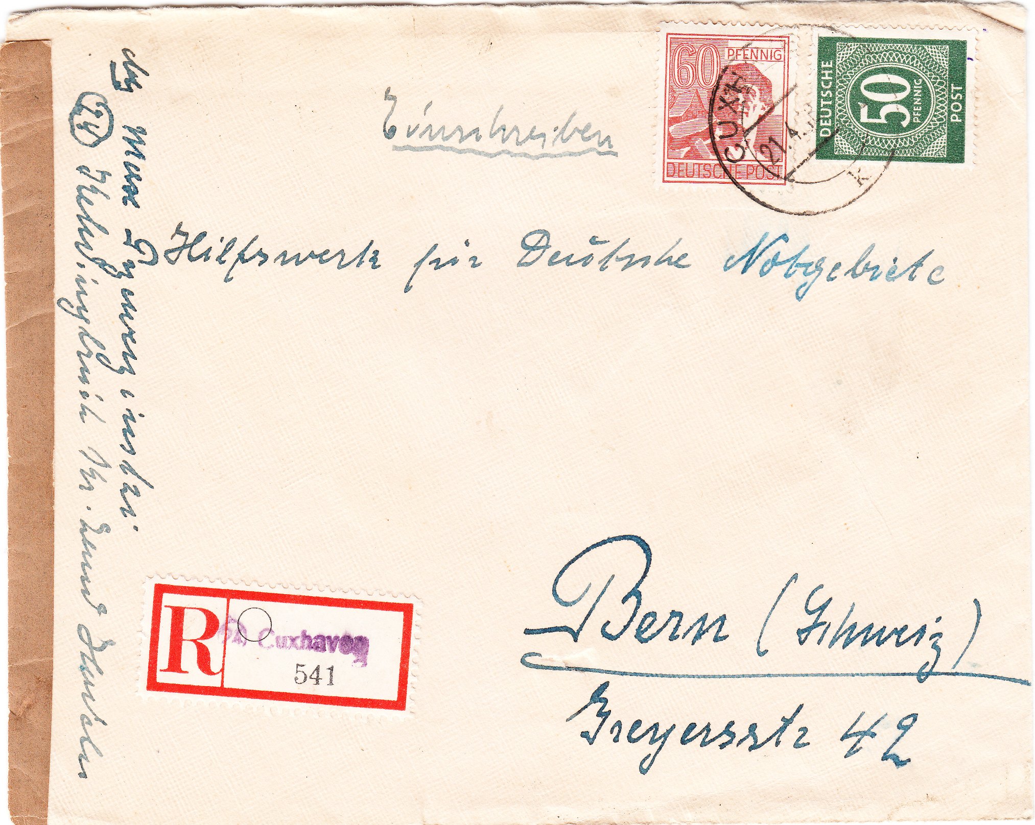 Dieser Auslandsbrief in die Schweiz (50 Pf) per Einschreiben (60 Pf), aufgegeben in Cuxhaven am 21.04.1948, wurde in der britischen Zensurstelle linksseitig geöffnet und mit einem neutralen Verschlußzettel wieder verschlossen: