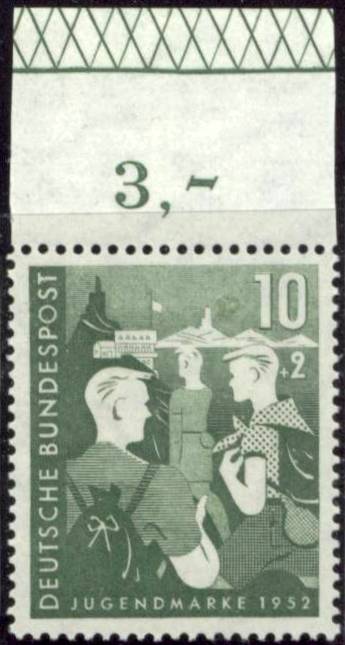 Es gibt nur eine Ausgabe der Deutschen Bundespost, die links unten im Bogenrand die Bogennummer aufweist. Es ist die Nummer 116. Der Bogennummer ist ein Buchstabe (A oder B) vorangestellt. Der Druckbogen hier hatte 2 Schalterbogen, der „A-Bogen“ ist der linke und „B“ der rechte Schalterbogen, beide haben dann die identische Nummer. Mir liegt leider keine solche Marke vor und daher bediene ich mich zum zeigen einer Ausgabe des Saarlandes mit einer Bogennummer.