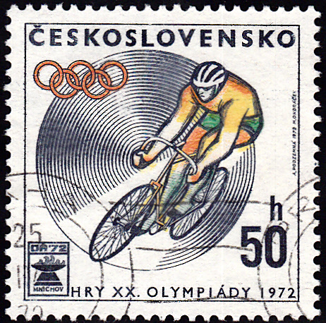 Es folgt eine Marke aus der Serie der Tschechoslowakei (MiNr 2067) zu den Sommerspielen 1972 mit einem Radrennfahrer im Markenbild.