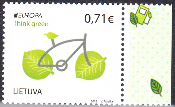 In Litauen sind die Europamarken 2016 am 7.5.2016 erschienen. Hier eine Marke zu 0,71€ zum Gemeinschaftsthema "Umweltbewusst leben" mit dem Motiv "Fahrrad mit Blättern". Die Auflage dieser Marke aus Zehnerbögen betrug 300 000 Stück. Hier eine postfrische Marke: