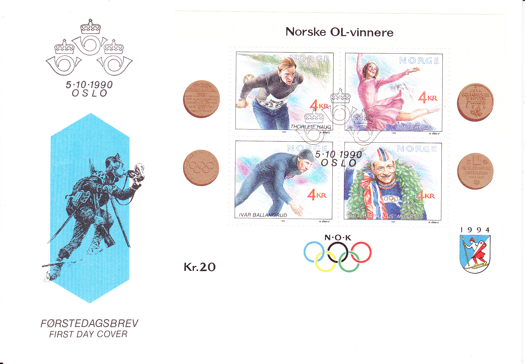 Hier wurde der Block aus Norwegen (MiNr Block 17) mit vier Marken von Olympiasiegern von 1952 auf einem FDC der norwegischen Post mit dem Ersttagsonderstempel entwertet.