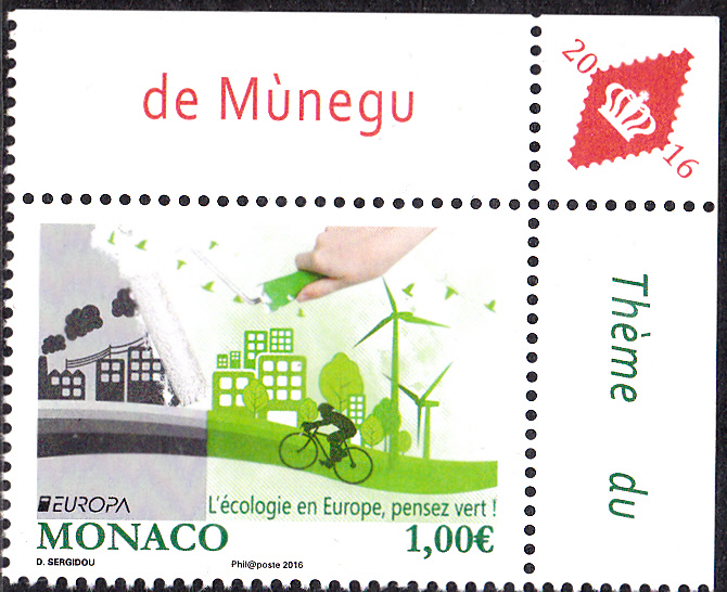 In Monaco sind die Europamarken 2016 am 9.5.2016 erschienen. Die Marke zu 1,00€ erschien zum Gemeinschaftsthema "Umweltbewusst leben" mit dem Einheitsmotiv "Von Grau zu Grün" nach einer Grafik von Doxia Sergidou (Zypern). Die Auflage dieser Marke betrug 50 000 Stück. Hier eine Marke vom rechten oberen Bogenrand: