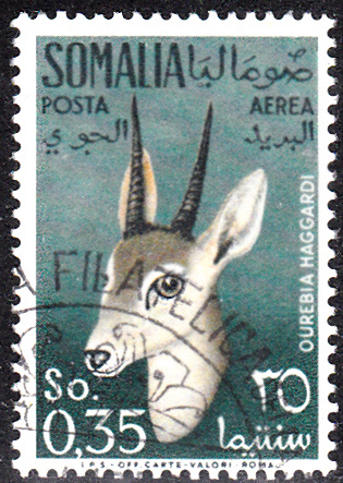 Diese Marke aus Italienisch-Somaliland (MiNr 306) zeigt den Kopf eines Südlichen Oribi oder Bleichböckchen (Ourebia ourebi), von dem es 13 Unterarten gibt. Auf der Marke ist der Kopf der Unterart Haggard-Bleichböckchen (Ourebia haggardia) zu sehen.