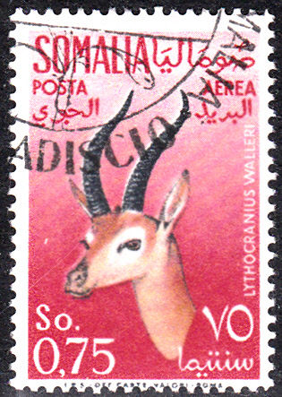 Diese Marke aus Italienisch-Somaliland (MiNr 309) zeigt den Kopf der hier bereits vorgestellten Südlichen Giraffengazelle (Litocranius walleri).