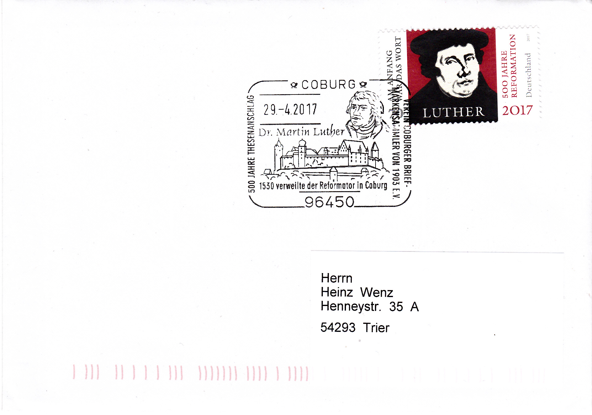 Dieser Sonderstempel aus Coburg vom 29.4.2017 dokumentiert Martin Luthers Aufenthalt 1530 auf der Veste Coburg. Im Stempelbild werden ein Porträt von Martin Luther und die Veste Coburg gezeigt.