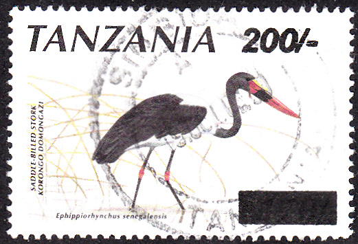 Diese Marke aus Tansania mit dem Sattelstorch (Ephippiorhynchus senegalensis) wurde einige Jahre nach der Ausgabe mit einem neuen Wertaufdruck versehen (MiNr 3151).