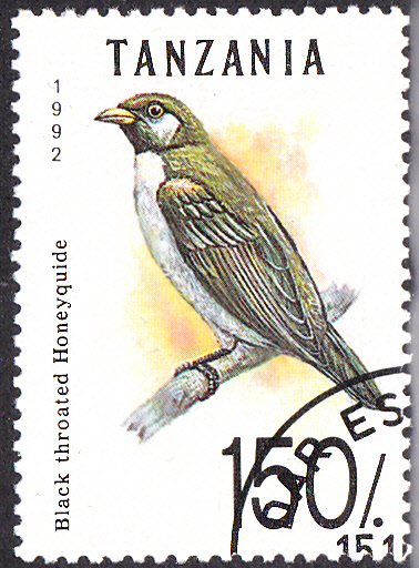 Aus Tansania kommt diese Marke (MiNr 1321) mit einem Großen Honiganzeiger (Indicator indicator).