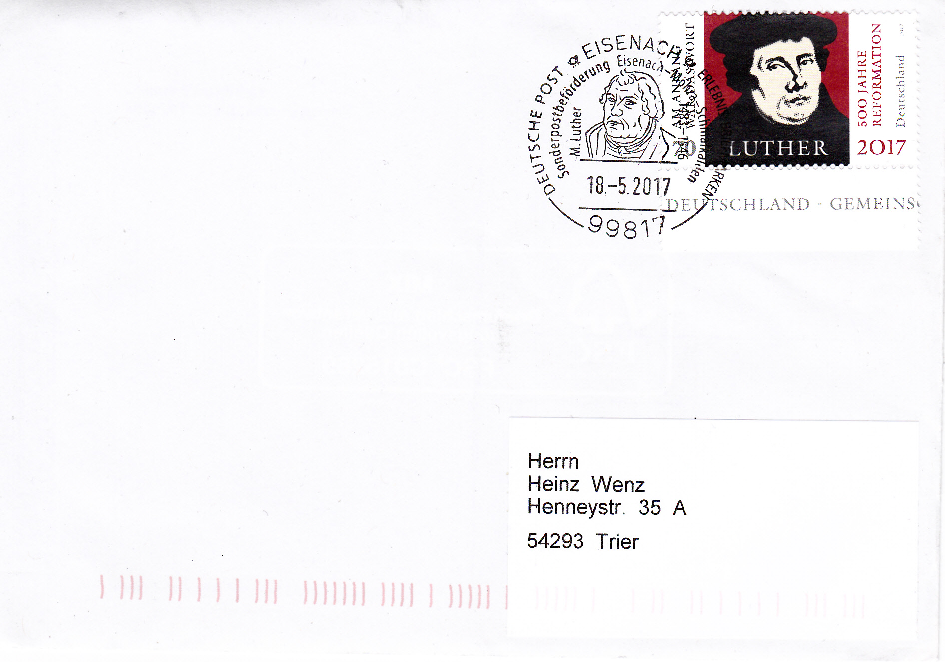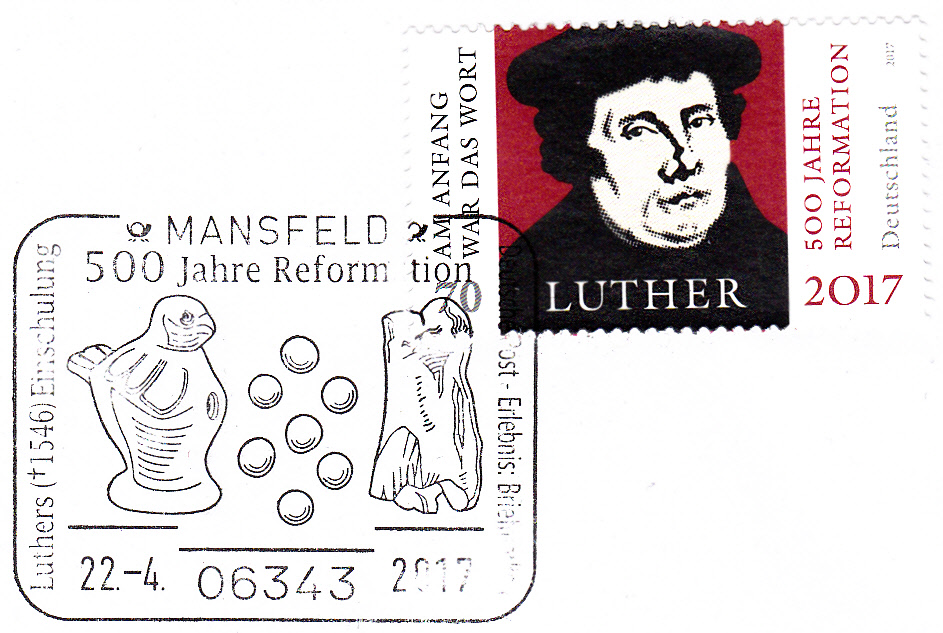 Dieser Sonderstempel aus Coburg vom 29.4.2017 dokumentiert Martin Luthers Aufenthalt 1530 auf der Veste Coburg. Im Stempelbild werden ein Porträt von Martin Luther und die Veste Coburg gezeigt.