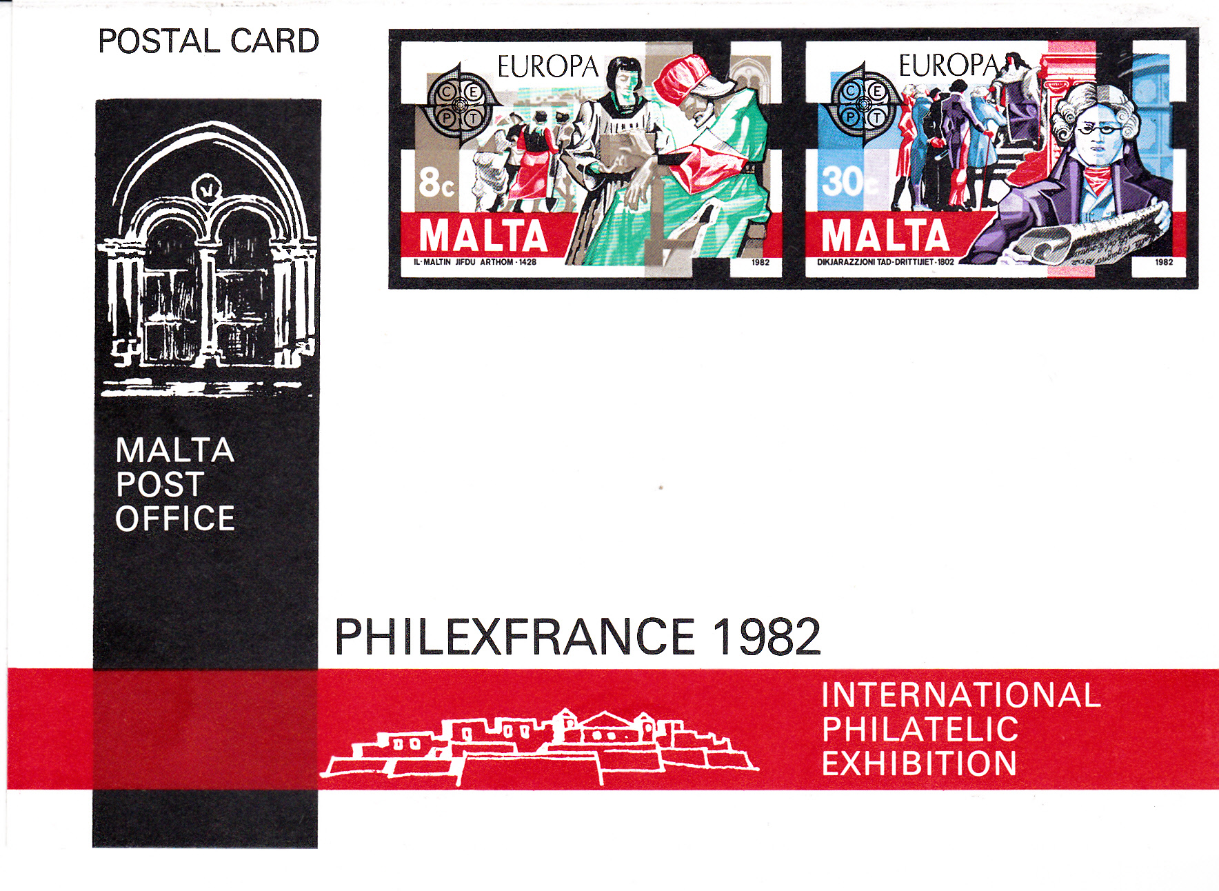 In Malta erschienen die Europamarken 1982 zum Gemeinschaftsthema "Historische Ereignisse" am 29. April 1982. Hier eine Marke zu 8 Cent vom rechten oberen Eckrand mit einer Darstellung zum Thema "Auslösung Maltas aus der Pfandschaft der Vizekönige von Sizilien (1428)".