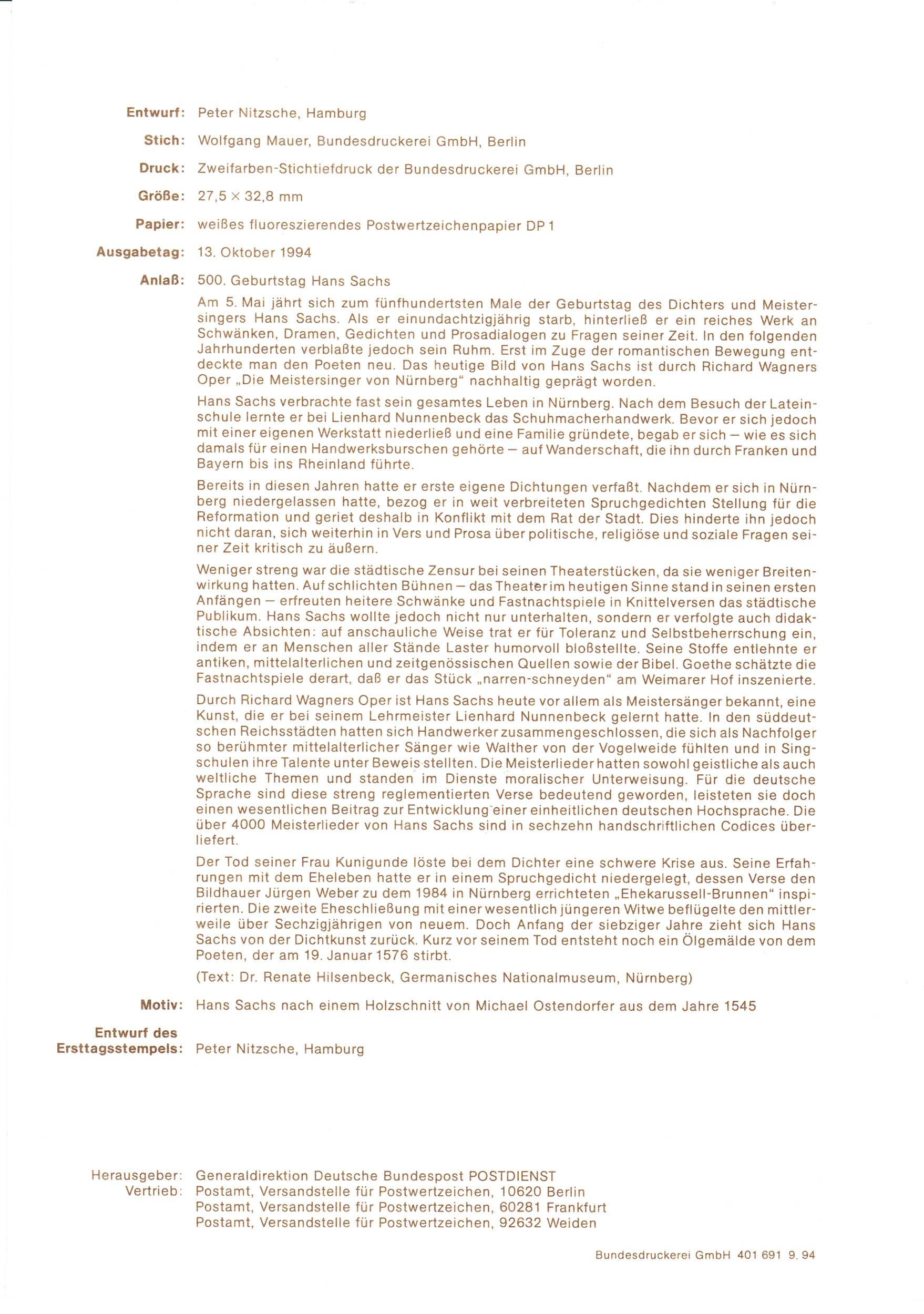 Eine Marke zum 500. Geburtstag von Hans Sachs (MiNr 1763) wurde hier mit dem Ersttagsonderstempel entwertet.