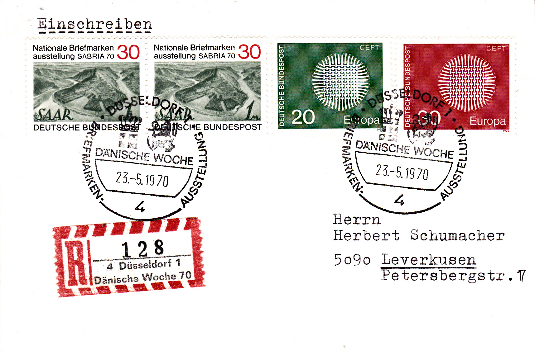Einschreibebrief von Düsseldorf nach Leverkusen mit einem Sonder-R-Zettel " 4 Düsseldorf 1, Dänische Woche 70" und dem dazu passenden Sonderstempel aus Düsseldorf vom 23.5.1970.