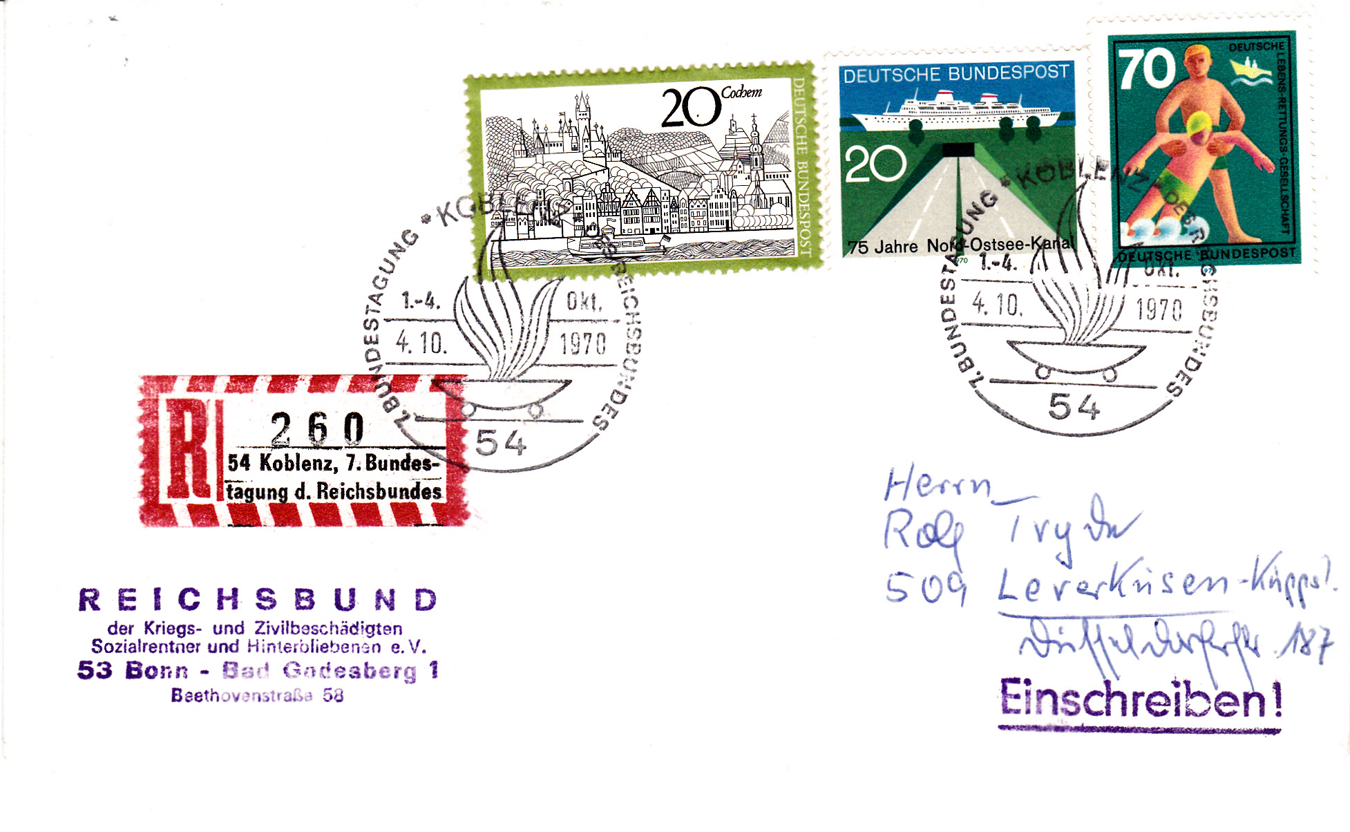 Einschreibebrief von Koblenz nach Leverkusen mit einem Sonder-R-Zettel " 54 Koblenz, 7. Bundestagung d. Reichsbundes" und dem dazu passenden Sonderstempel aus Koblenz vom 4.10.1970.