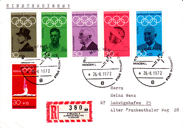Einschreibebrief von München nach Ludwigshafen mit einem Sonder-R-Zettel "8 München 2 Olympische Spiele 1972 in München" und einem dazu passenden Sonderstempel aus München vom 26.8.1972 zum Olympischen Handballturnier.