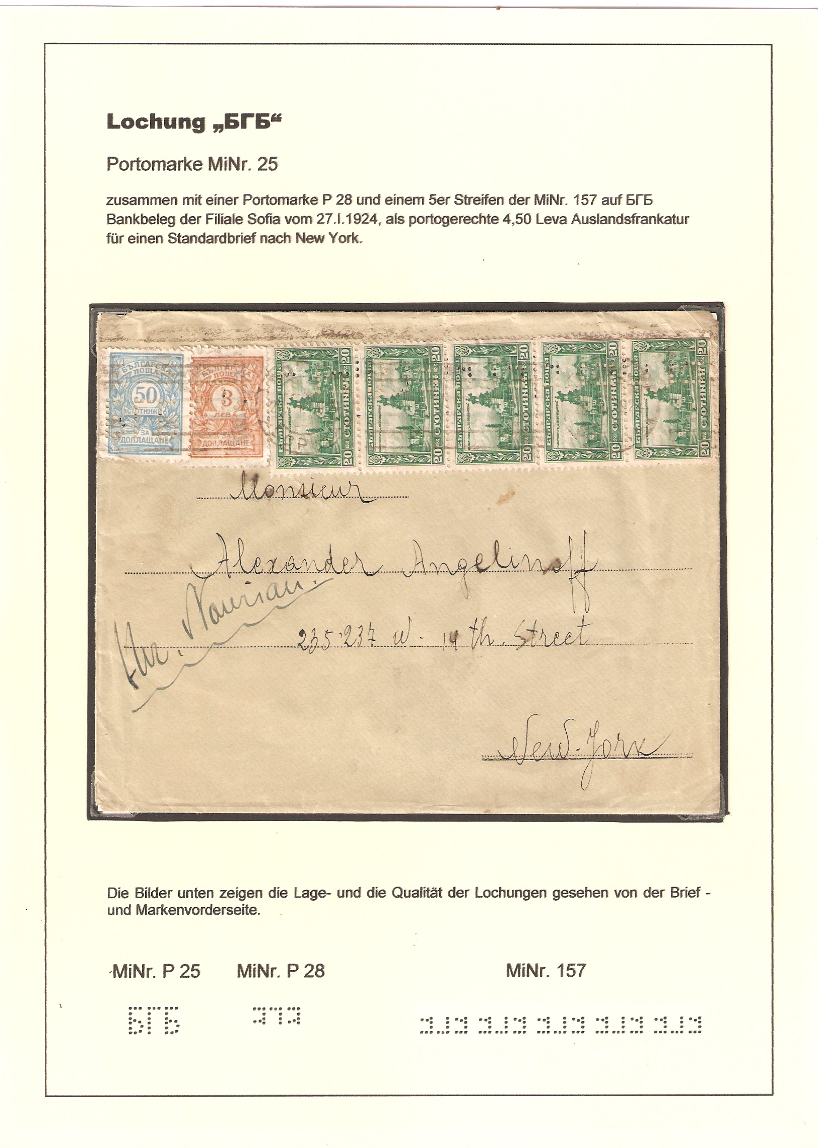 die perfekte Lochung der Marke auf dem hier gezeigten Beleg vom 19.IV.1924 deutet sehr auf die zwischenzeitliche Reparatur der Lochungsmaschine in der sofioter Filiale hin. (Standardporto für Briefe bis 20 Gr. = 3 Leva.)
