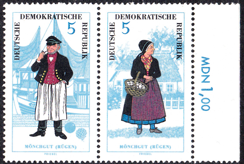 Dieses Zusammendruckpaar (MiNr W ZD 145) mit den beiden Marken MiNr 1075/1074 zeigen einen Mann und eine Frau in der Tracht der Mönchguter Fischer.