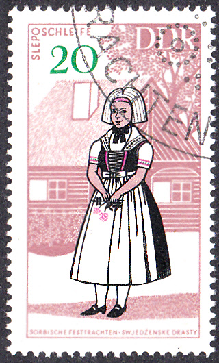 Auf der Marke zu 20Pf (MiNr 1354) wird die Tracht einer Brautjungfer aus Schleife (Krs. Weißwasser) gezeigt.