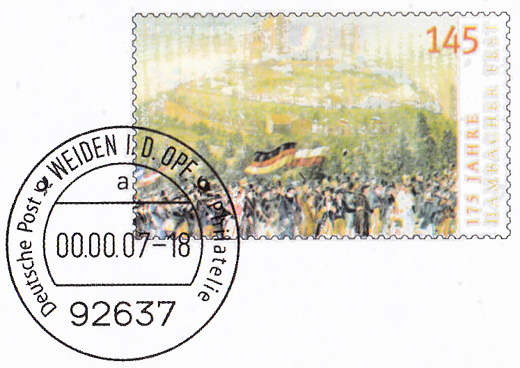 Dieser Ganzsachenumschlag im Format 229 x 324 mm hat einen Wertstempel mit der Marke zu 145 Cent zum Jubiläum "175 Jahre Hambacher Fest" (MiNr 2603). Die Vorausentwertung hat das Datum "20.10.08-18". Der Umschlag ist unter der MiNr EA F372 katalogisiert. Der Scan erfasst nicht den gesamten Umschlag, da zu groß für die DIN A4 Scan-Fläche.