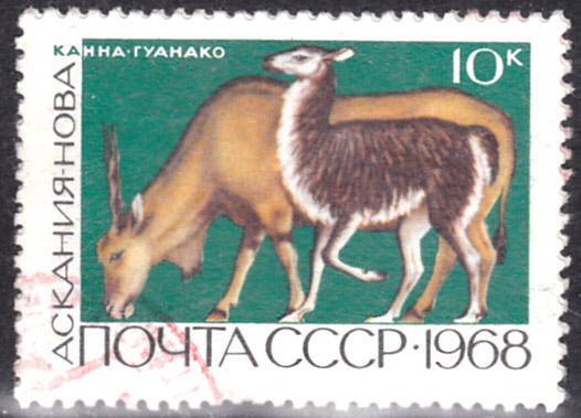 Auf dieser Marke der Sowjetunion (MiNr 3549) wird vorne ein Guanako (Lama guanicoe) gezeigt.