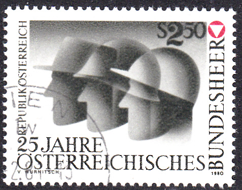 Auf dieser Marke aus Österreich (MiNr 1659) zum Jubiläum "25 Jahre Österreichisches Bundesheer" trägt der symbolisch dargestellte Soldat in der Mitte des Markenbildes einen Stahlhelm.