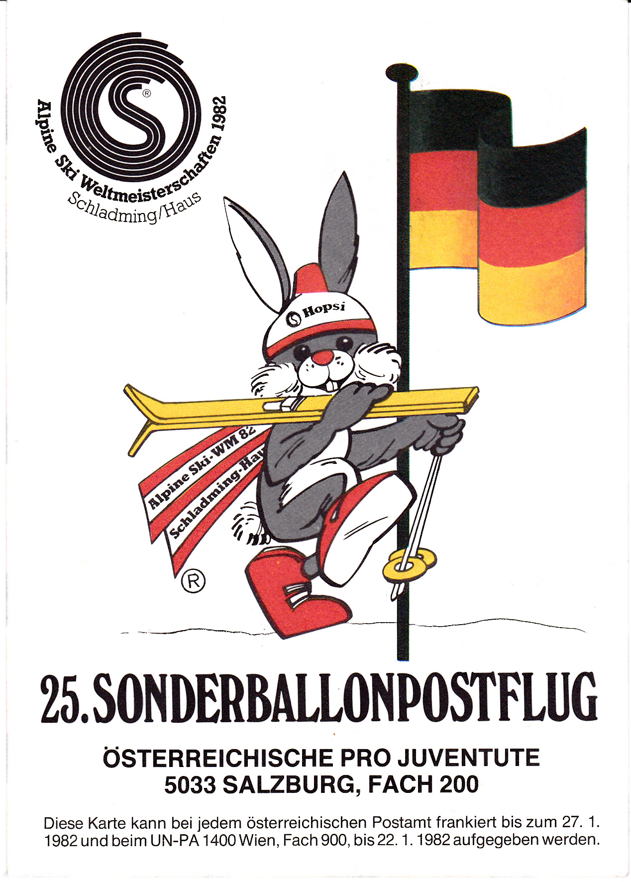 Diese Karte wurde mit der Marke zu den Alpinen Skiweltmeisterschaften 1982 frankiert am 3.2.1982 in Schladming für den 25. Sonderballonpostflug der Österreichischen Pro Juventute mit dem Freiballon OE-AZR aufgegeben. Sie erhielt den Sonderstempel mit der Kennziffer "4" aus Schladming zu diesem Ballonflug und wurde am gleichen Tag mit dem Freiballon OE-AZR befördert. Sie erhielt zusätzlich einen Bordstempel und einen Tagesstempel aus Filzmoos.