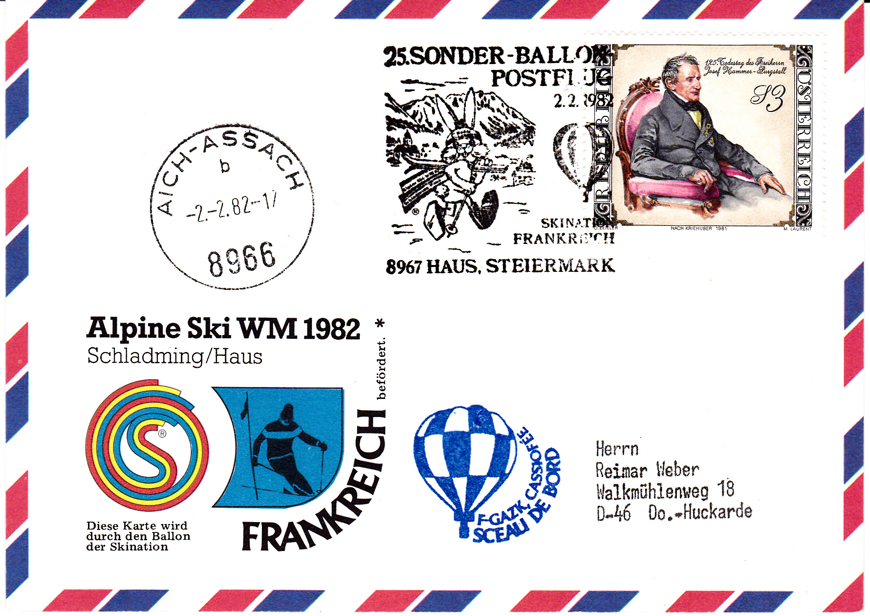 Hier eine weitere Postkarte, die mit dem Ballon F-GAZK, CASSIOFÉE befördert und mit dem passenden SST aus 8967 Haus, Steiermark am 2.2.1982 abgestempelt wurde.