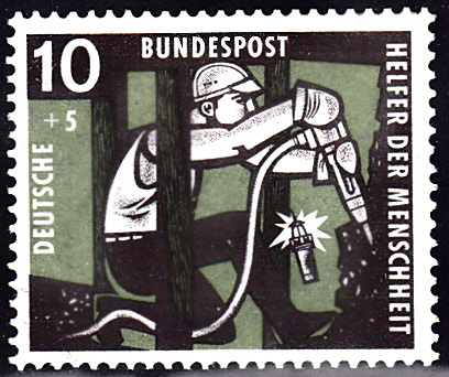 Ein Beispiel findet sich in der Dauerserie Unfallverhütung, hier die Version aus Berlin, MiNr. 406: