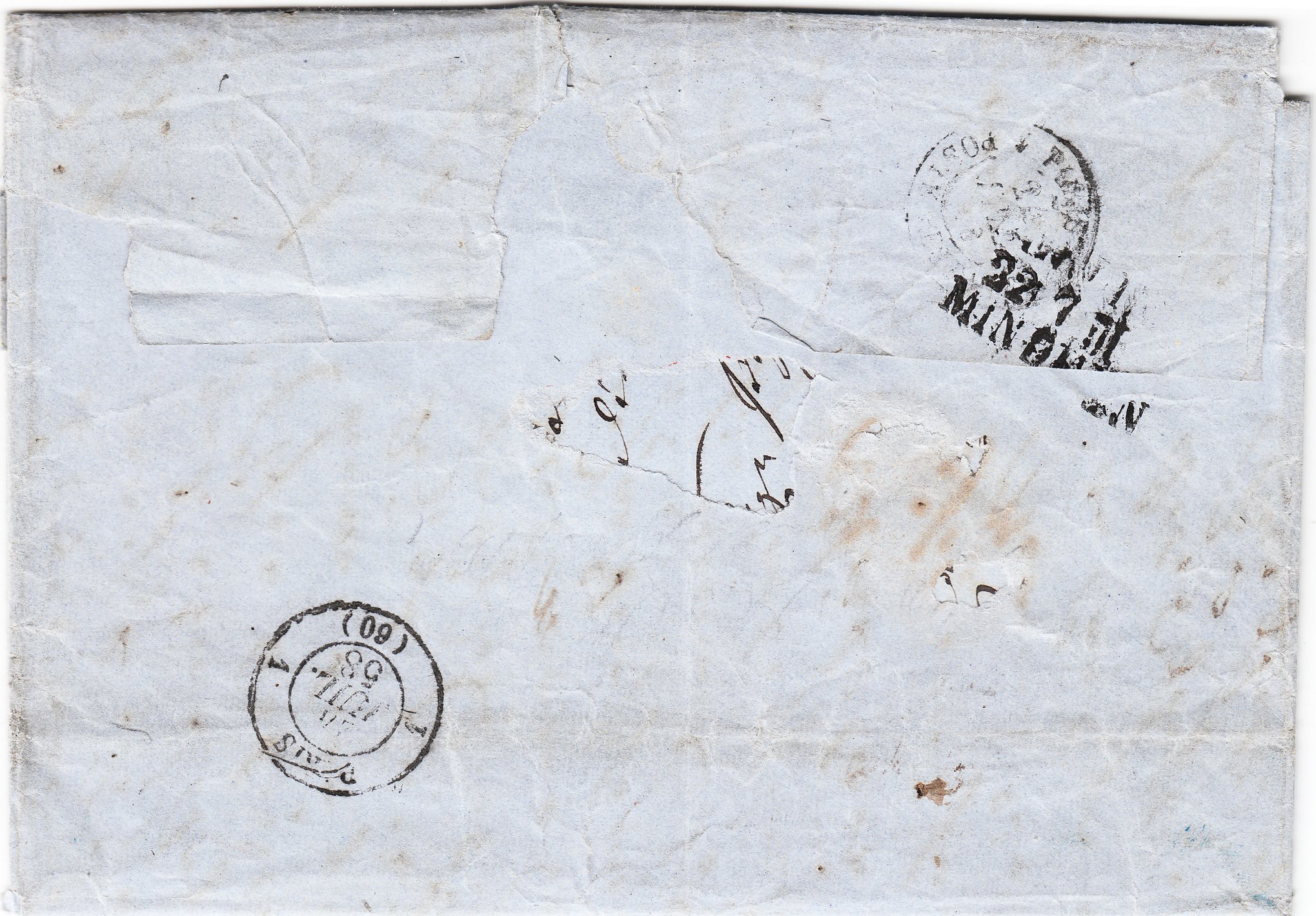 Rückseitig drei Zweikreisstempel vom 13.02.1855, einer aus Paris, einer von der Bahnpost Paris - Strasbourg sowie einer aus Reims: