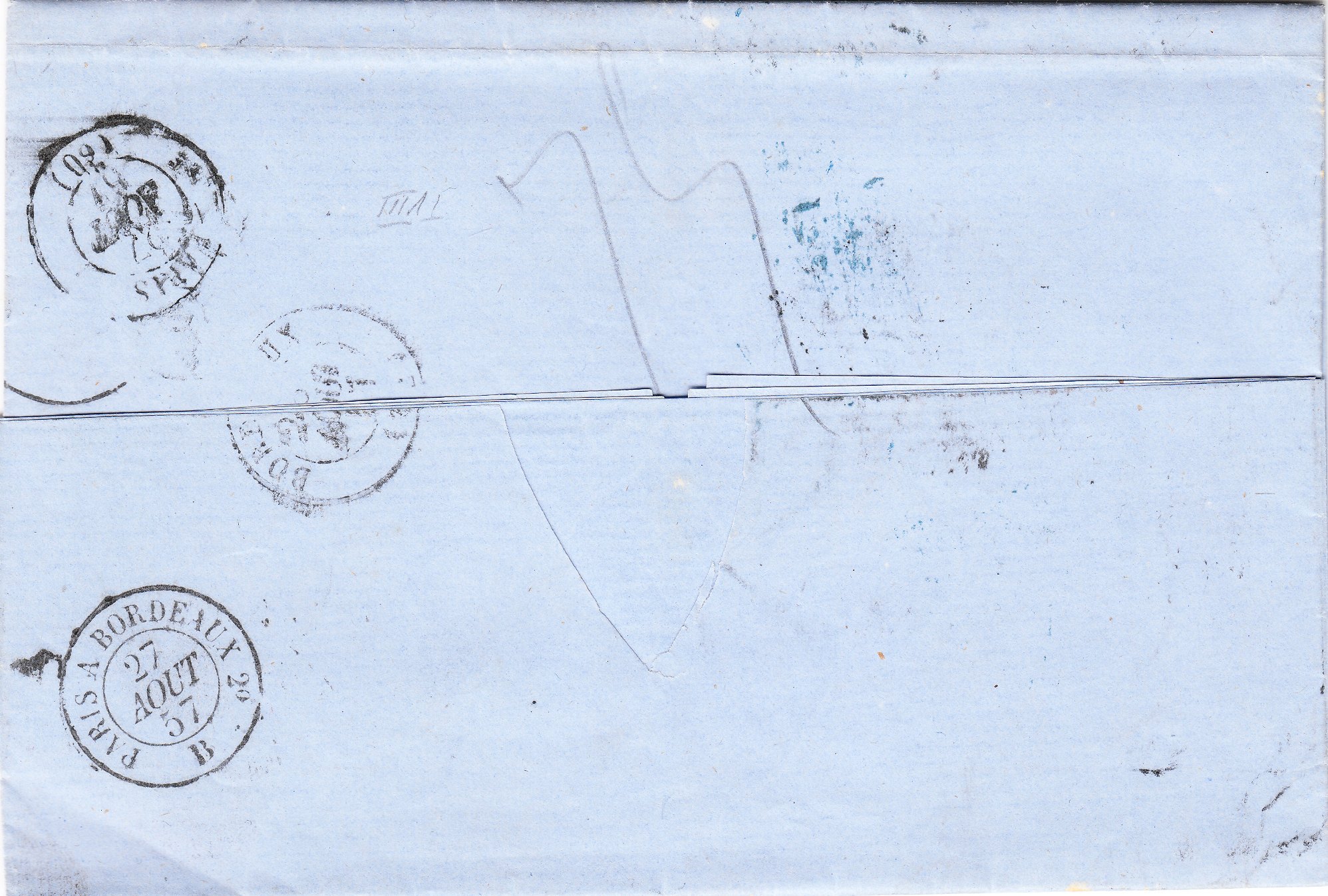Dieser Brief lief am 26.08.1857 ab "AACHEN NACHTS" über Valenciennes und Paris sowie die Bahnstrecke Paris-Bordeaux nach Bordeaux, was rückseitig Durchgangsstempel dokumentieren: