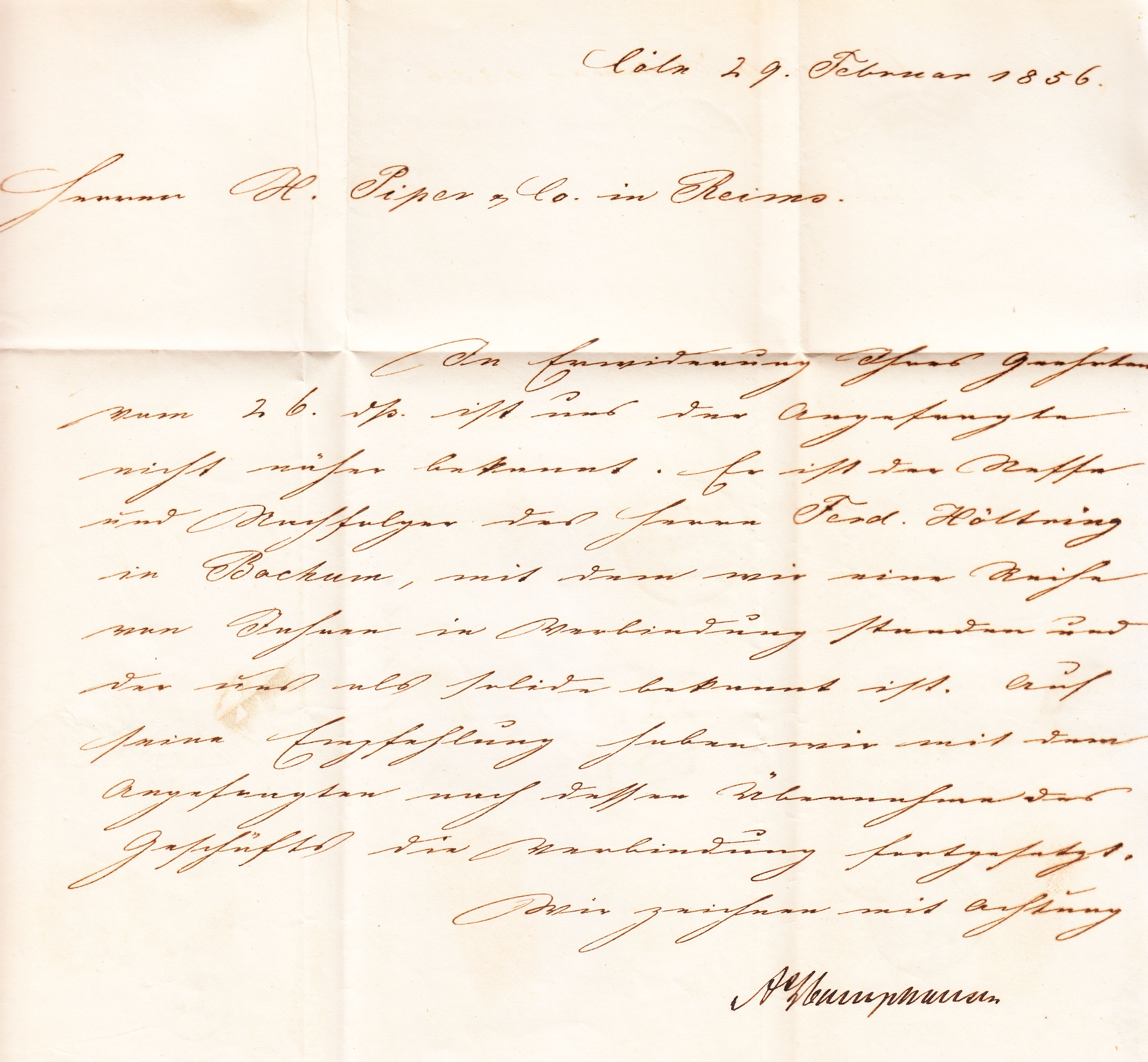 Dieser am 29.02.1856, also am Schalttag(!), geschriebene, nach Reims adressierte Brief, wurde noch am selben Tag zwischen 6 und 7 Uhr abends in "COELN" aufgegeben: