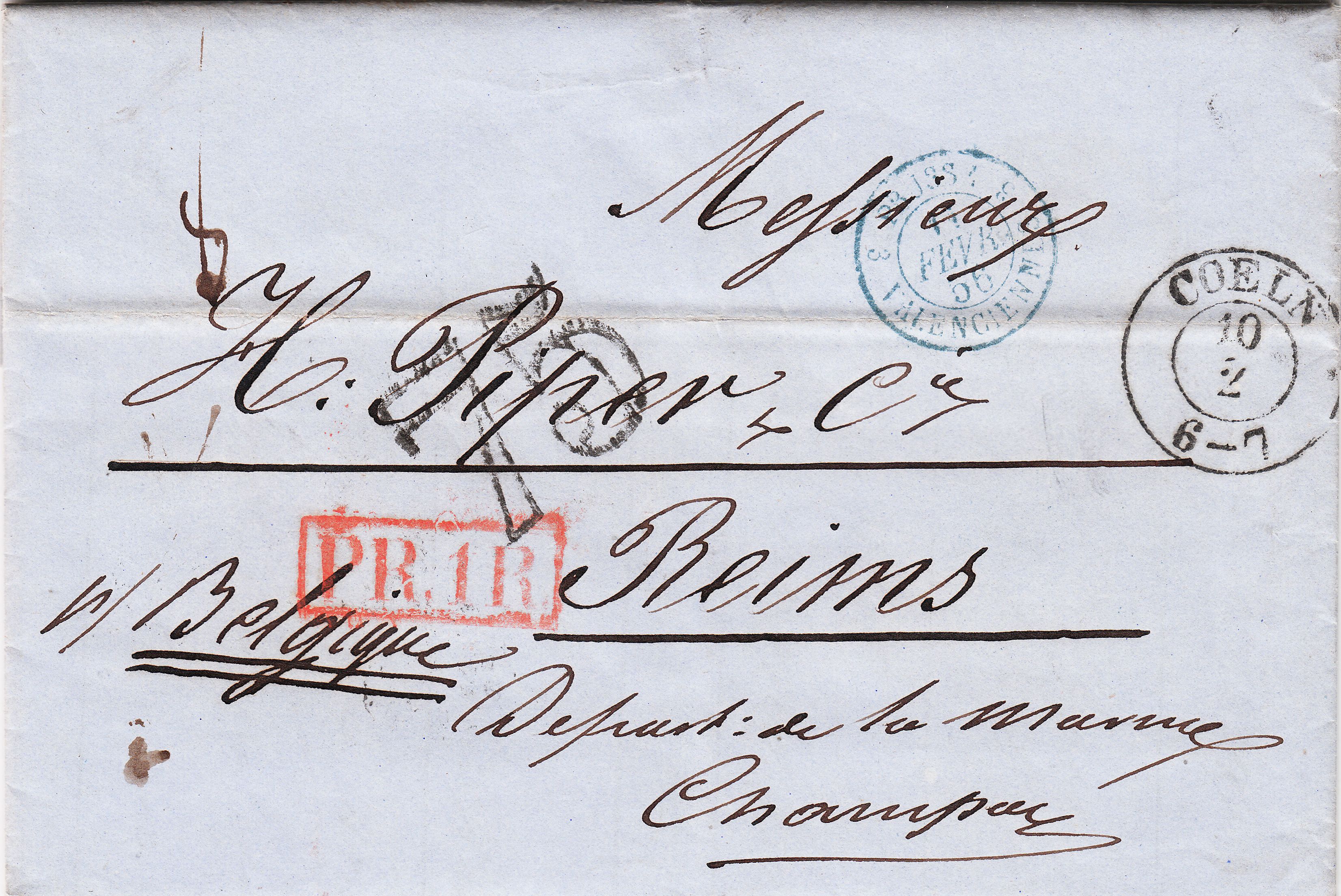 Dieser nach Reims adressierte, am 11.02.1855 in "COELN" aufgegebene Brief lief am 13.02.1855 über das belgisch-deutsche Grenzpostamt Valenciennes, wo ein Zweikreisstempel "3" in Rot abgeschlagen wurde: