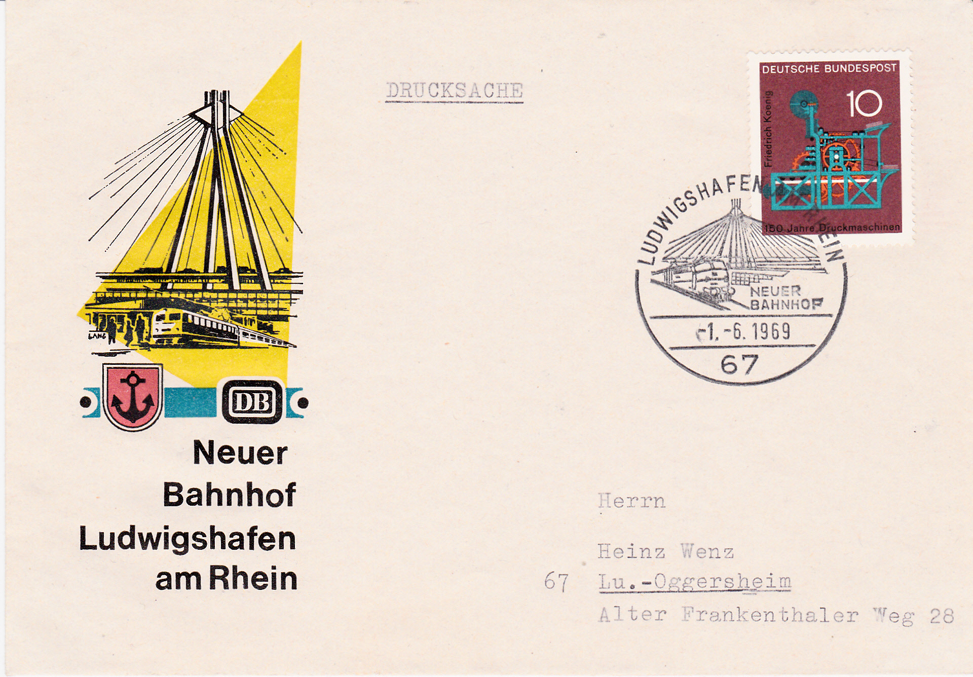 Dieser Sonderstempel aus Ludwigshafen am Rhein vom 1.6.1969 dokumentiert die Eröffnung des Bahnhofes. Im Stempelbild wird die Schrägseilbrücke gezeigt, die den Bahnhof in einer Höhe von 14 Meter überquert. Das eigentliche Bahnhofsgebäude ist unterhalb der Brücke erkennbar. Das Empfangsgebäude liegt zum Teil unterhalb der Hochbahnsteige.