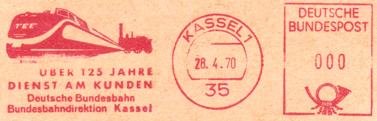 Im Absenderfreistempel der Bundesbahndirektion Kassel wurde Anfang der 1970er-Jahre im Werbeeinsatz auch ein TEE gezeigt. Hier ein Probeabdruck vom 28.4.1970 mit Wertstellung "000".