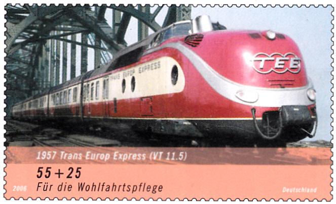 Auf einer Marke aus der Jugendmarkenserie 2006 der Deutschen Post (MiNr 2562) wird ein Trans Europ Express VT 11.5 aus dem Jahre 1957 abgebildet.
