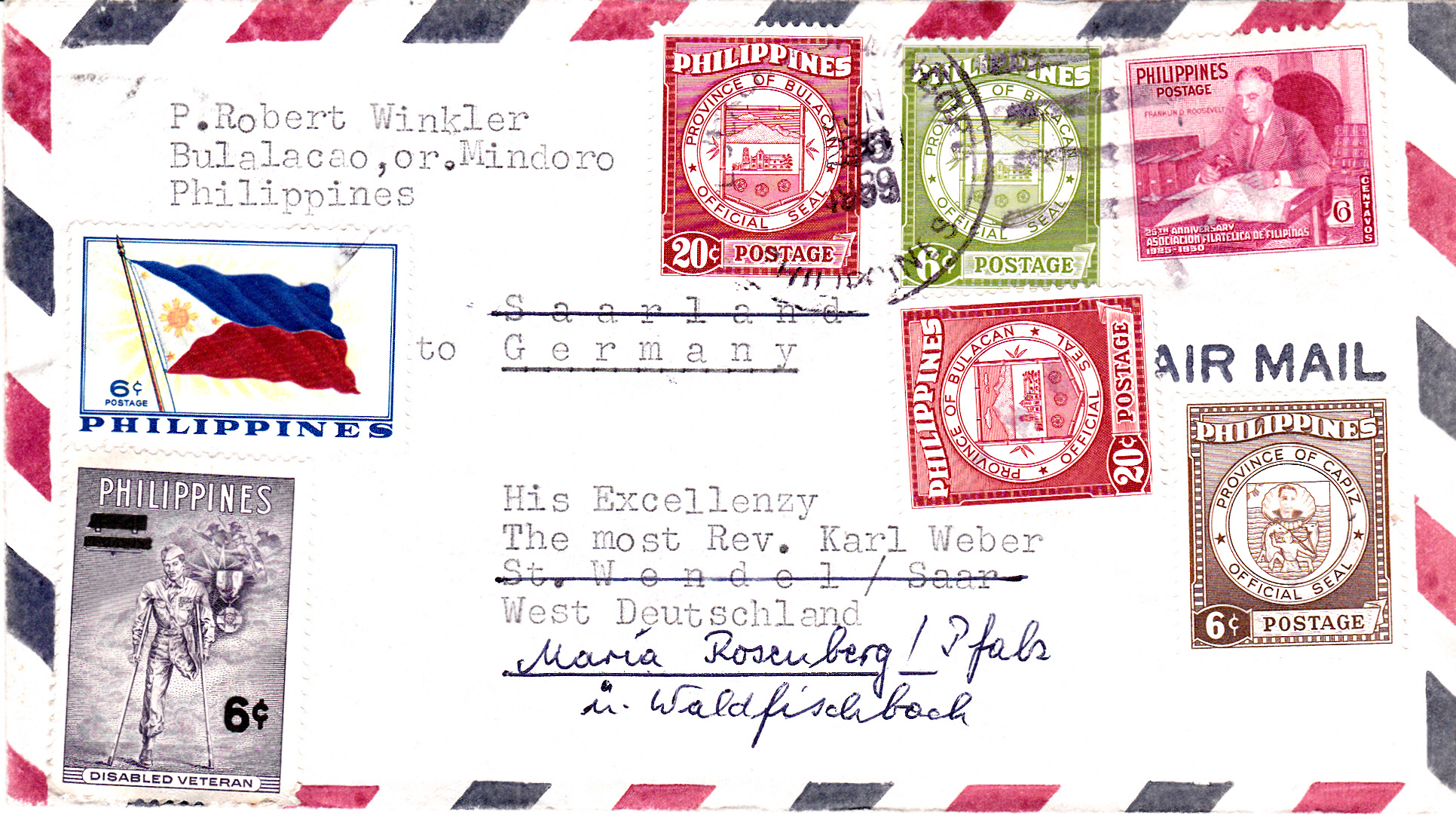 Auf diesem Luftpostbrief aus den Philippinen nach St. Wendel/Saar, nachgesandt nach Waldfischbach, wurde oben rechts eine Sondermarke zu 6 C "25 Jahre Philippinische Philatelistengesellschaft" (MiNr 509) mit der Abbildung "Franklin D. Roosevelt mit seiner Briefmarkensammlung" zur Frankatur benutzt.