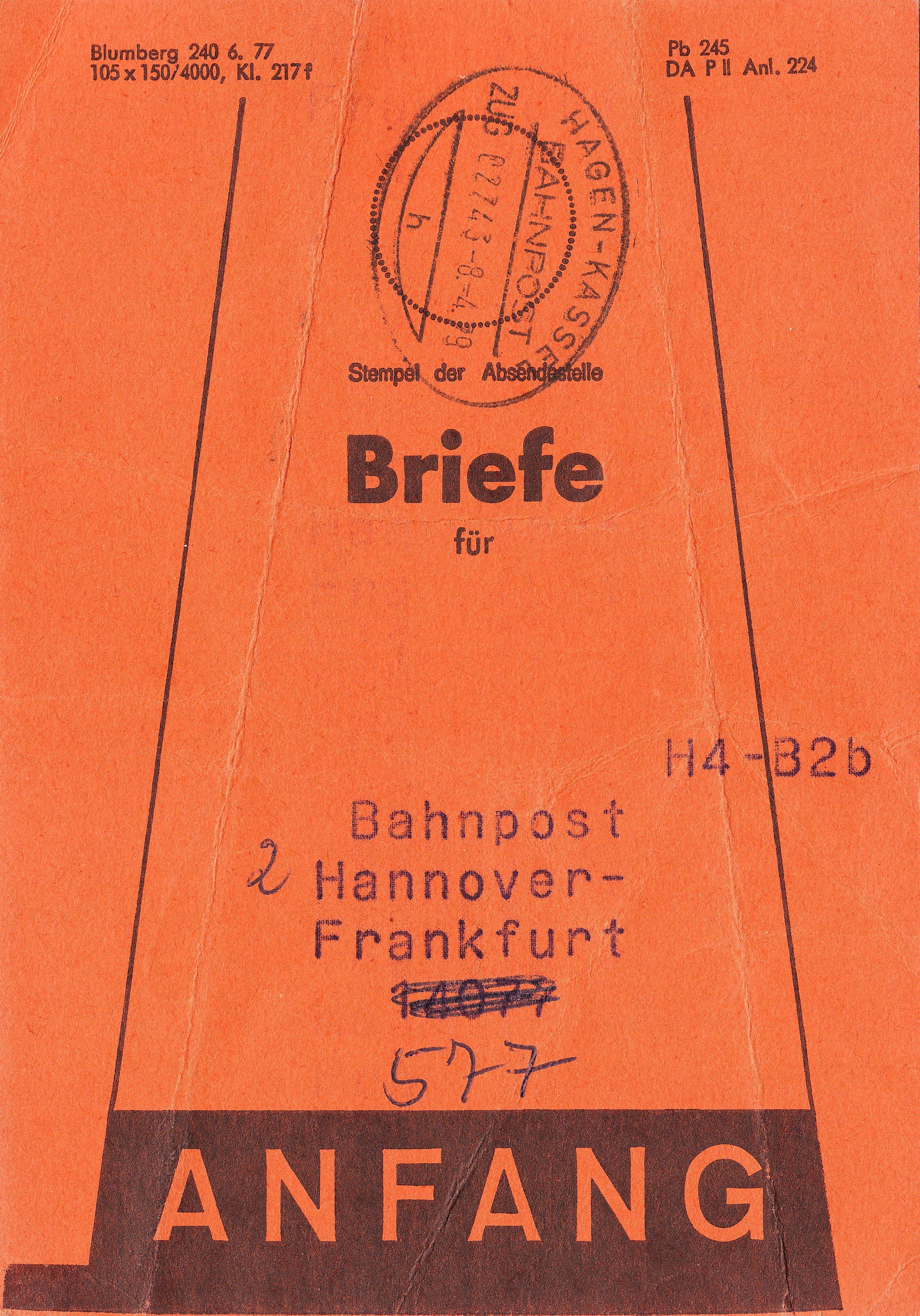 Diese Beutelfahne "ANFANG" wurde am 08.04.1979 im "ZUG 02743" auf der Strecke von Hagen nach Kassel verwendet für einen Beutel an die "Bahnpost Hannover - Frankfurt", wobei die Zugnummer handschriftlich geändert wurde von "14077" auf "577":