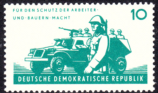 Auf dieser Marke aus Österreich (MiNr 1659) zum Jubiläum "25 Jahre Österreichisches Bundesheer" trägt der symbolisch dargestellte Soldat in der Mitte des Markenbildes einen Stahlhelm.