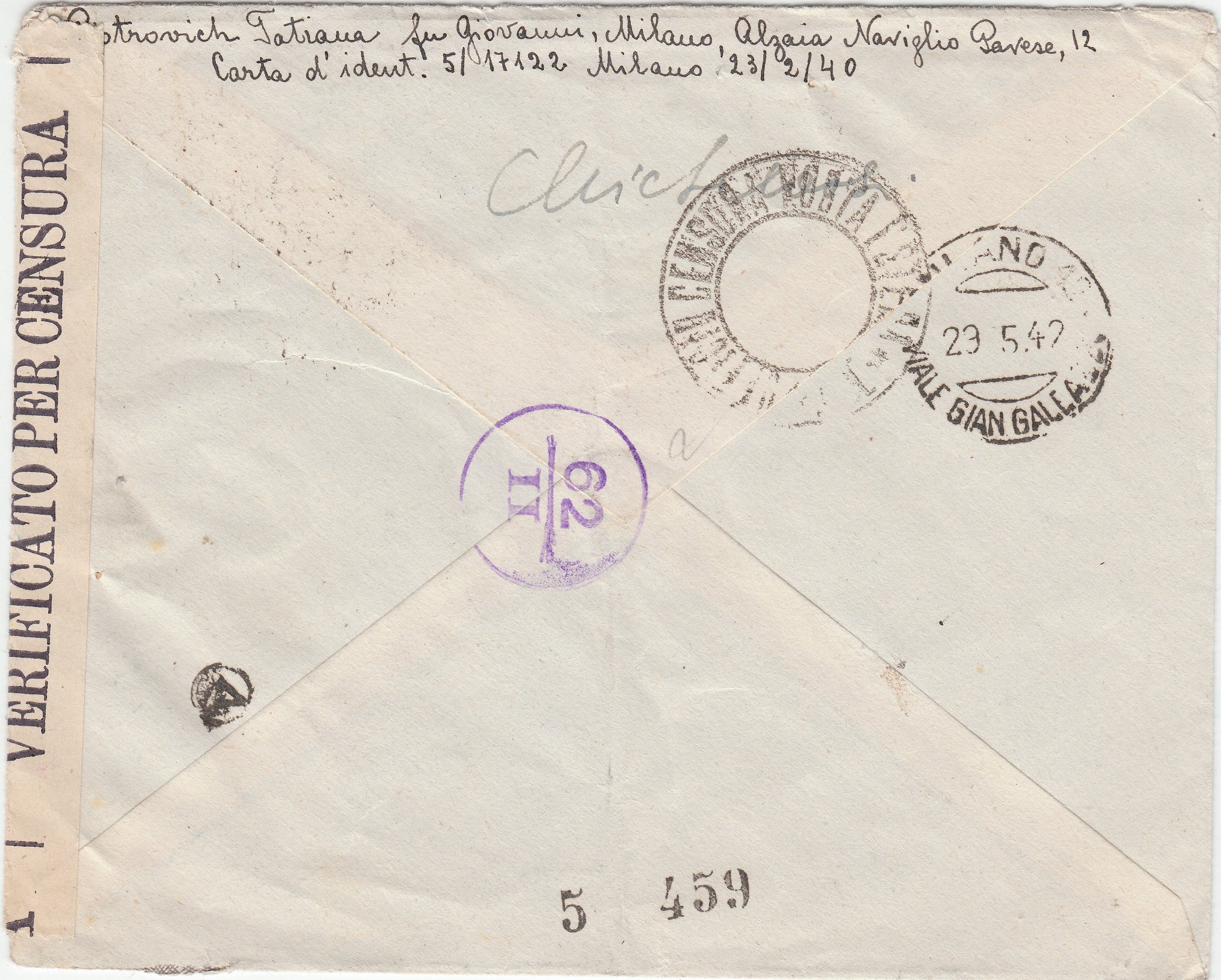 Dann durchlief der Beleg die italienische Auslandsbriefprüfstelle in Mailand, wo rückseitig der Zweikreisstempel "UFFICIO CENSURA POSTA ESTERA", Außendurchmesser 34 mm, Innendurchmesser 19 mm, abgeschlagen wurde. Der Brief wurde dort rechtsseitig geöffnet und mit einem 20 mm breiten Verschlußzettel mit vertikalen Trennstrichen "VERIFICATO PER CENSURA" wieder verschlossen.