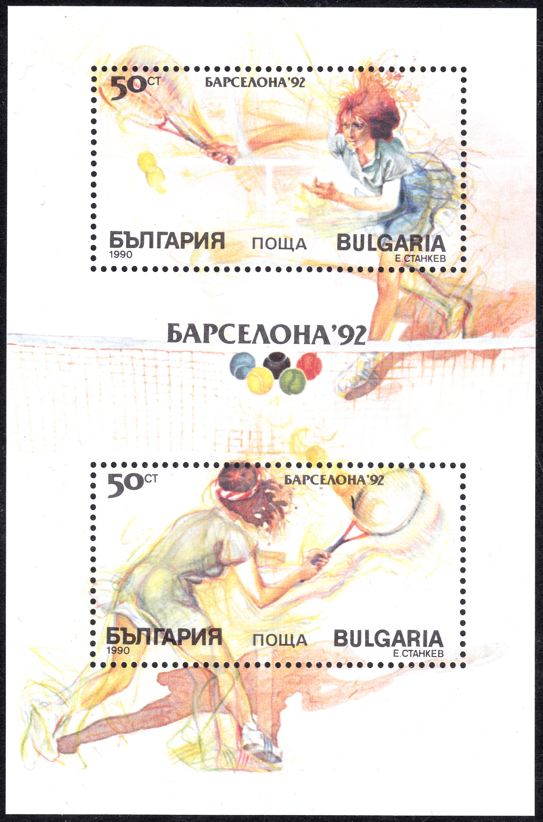 Auf diesem Block aus Bulgarien (MiNr Block 211 A) mit den beiden Marken MiNr 350 A und 3851 A ist ein Tennisspiel Einzel der Damen dargestellt. Auf den beiden Marken wird dabei je eine der beiden Spielerinnen abgebildet und das Netz auf dem Blockteil dazwischen.