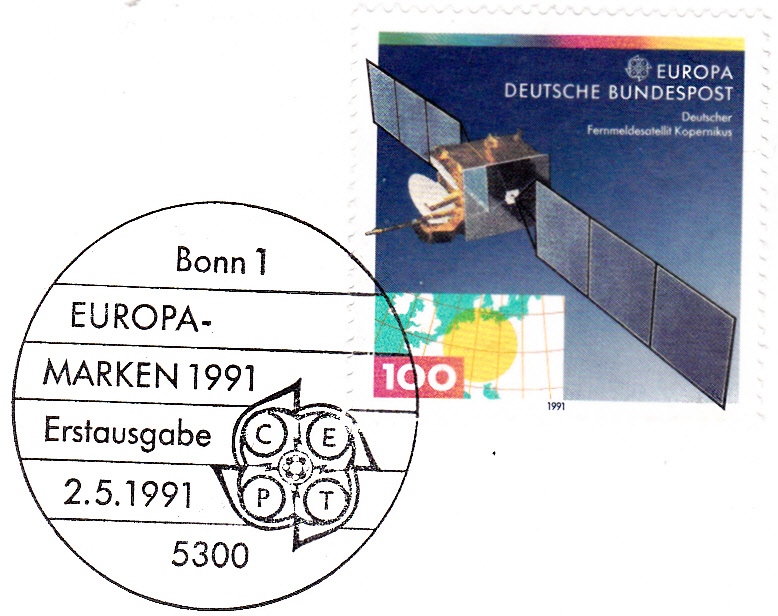 Bei der Deutschen Bundespost sind die Europamarken 1991 zum Gemeinschaftsthema "Europäische Weltraumfahrt" am 2.5.1990 erschienen. Hier die Marke zu 100 Pf mit dem Deutschen Fernmeldesatellit "Kopernikus".