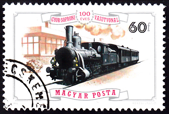 Im Hintergrund dieser Marke aus Ungarn (MiNr 3159 A) wird die Station Raab im 19. Jahrhundert auf der Eisenbahnlinie Raab-Ödenburg (Györ-Sopron) gezeigt.